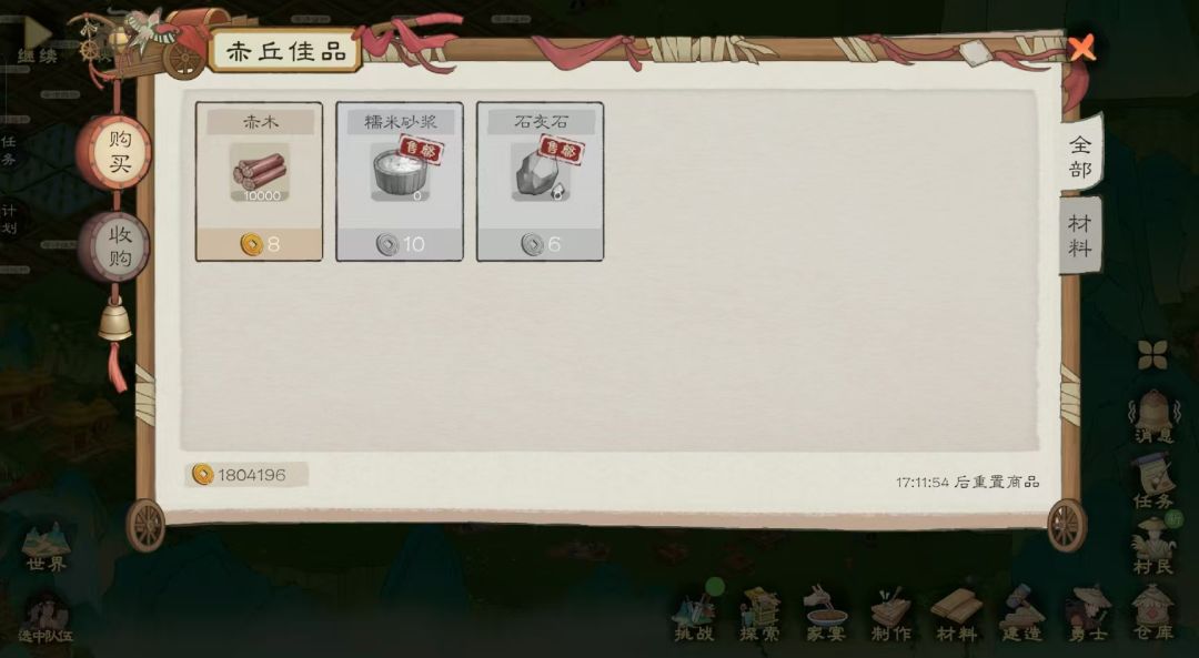 4、游戏内的几种商人: (1)几个村子的杂货铺商人和桃园货郎,主要售卖农作物种子,各种铁锭材料,调味料等(钱币有盈余,河肥每日要买,后面用于点满榕树和楠木科技) (2)各个村子声望商人主要购买图纸和技能书(优先购买建造,砍伐,采集,水晶尽量前期不购买) (3)神秘商人以及银蟾小摊(位于陶先生家银蟾小摊全天有;神秘商人将在家宴触发之后晚上刷新)优先购买离线研究和离线制作>精品食品菜谱>装饰物图纸,有箭楼底座钱币充余购买。 如图所示 :