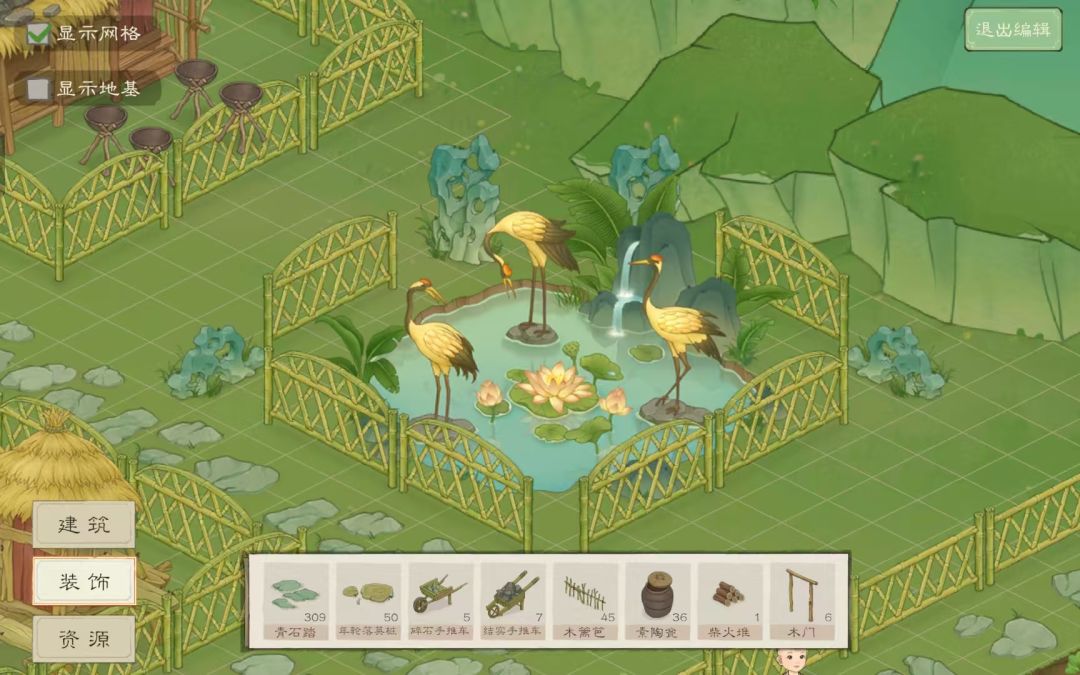 9、场景布局:(1)可查看建筑物的摆列情况 (2)装饰区域可以对地图进行装饰 (3)资源区域可以对已采集完的资源的幼苗进行摆放