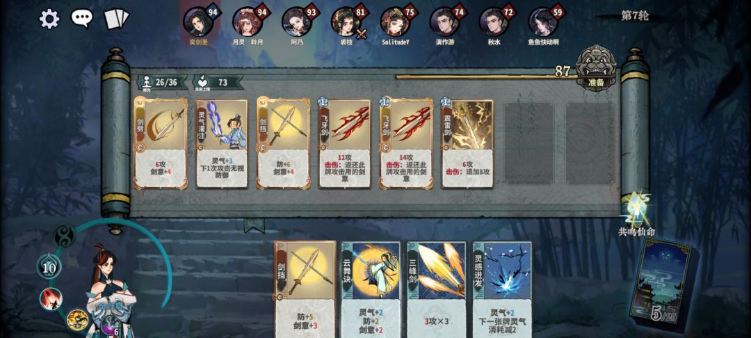 我们在炼气期 要待5回合,也就是第6轮才上金丹,主要是要把火刀刷出来,其次是要刷两张剑档,两张飞牙剑,至少都有各一张3级,而且是不留换牌次数,全用光,因为金丹期就有顿悟选了