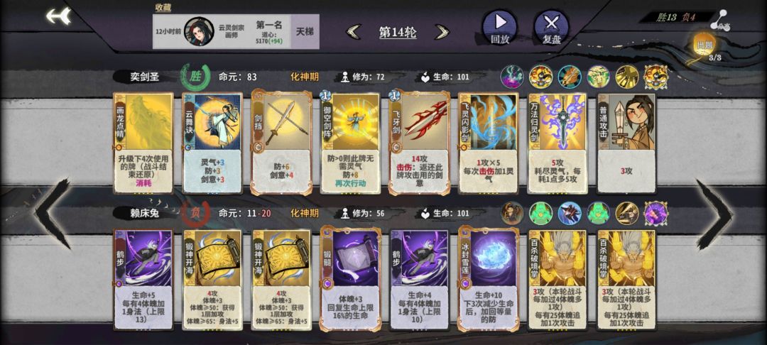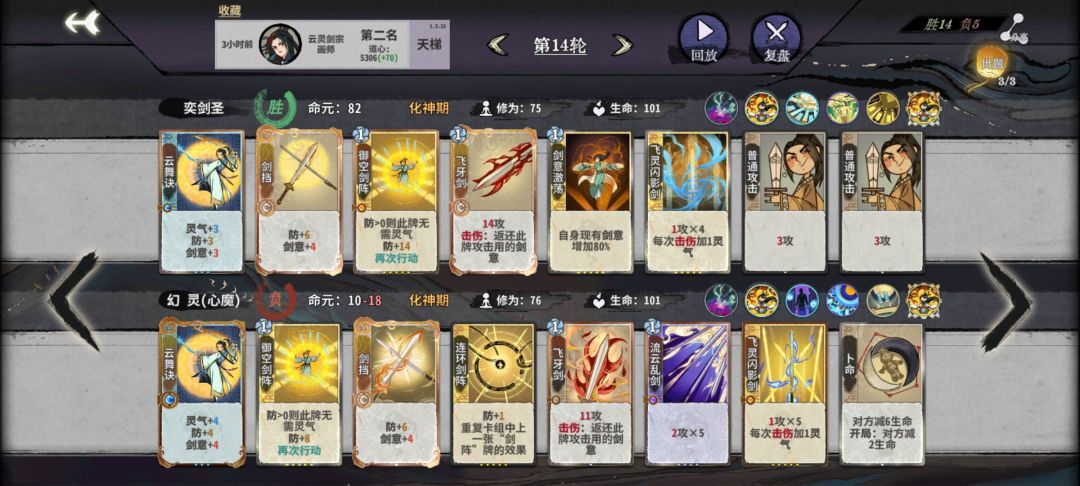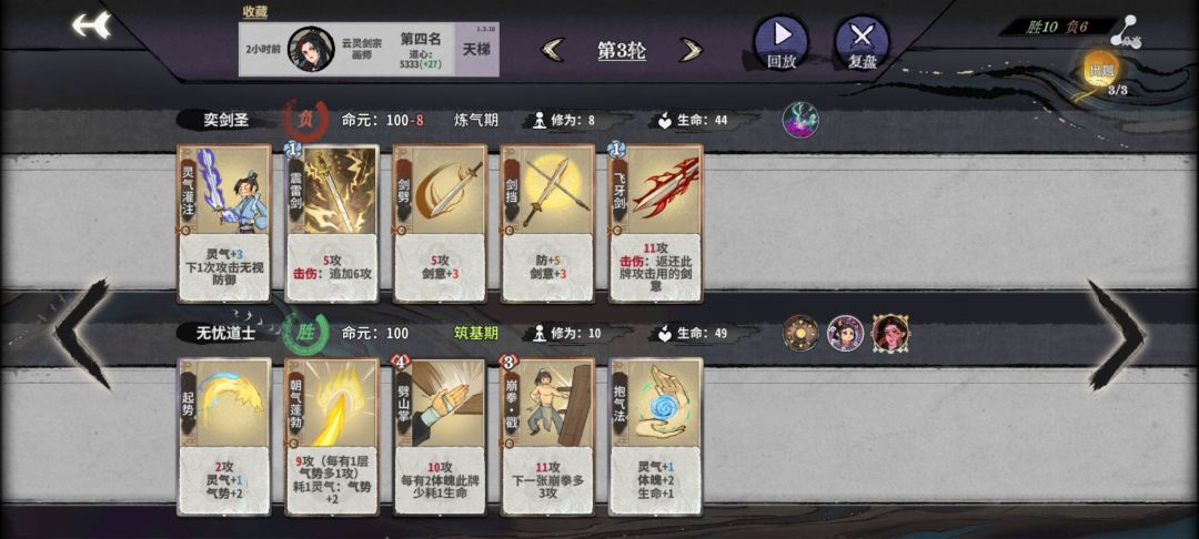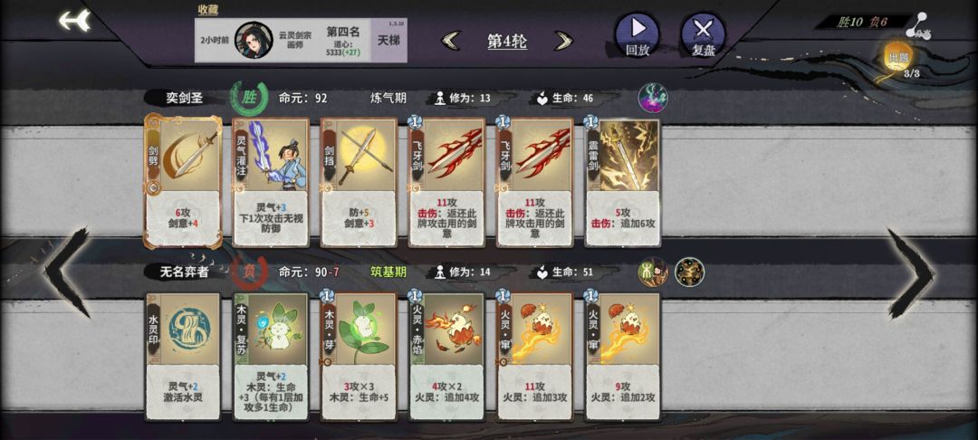 这里开始就留换牌次数了,再刷就意义不大,输了就输了吧,会影响化神期,因为核心牌都在化神,当然手黑也是常有的事,没有三峰剑,也没有流云乱剑,所以只能用两张飞牙剑+震雷剑,所以前面要刷两张飞牙剑,两张剑档