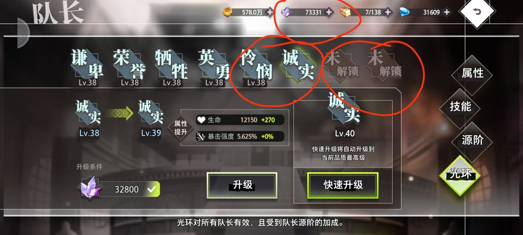 游戏到了38级队长光环会从4个增加到6个,新增加的两个得从1级升到38级。45级光环从6个增加到8个,同理也是从1级升到45级。这两个节点我们会发现晶石缺到爆炸,前期体力要用来推本、拉角色等级、拉装备等级。所以我们很难有体力匀出来刷日常训练里的魔女作战,所以就需要我们合理利用好前期的晶石。