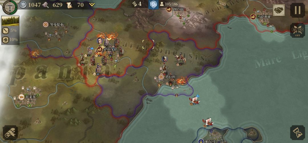 可以看到安东尼已经要被灭,不过因为前期摇摆国疯狂要钱不然这个时候至少已经打到北非本土了灭掉安东尼之后火速赶往北非爆破每回合都别闲着