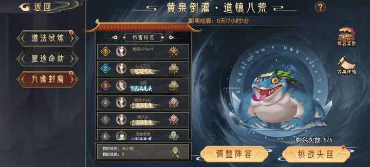第二天蛤蟆怪各种酸爽不用多说只能水队打啦,我个人是用柳上悟打的,低星能打多少我不知道,我只自己极限就是寂灭一的实力了