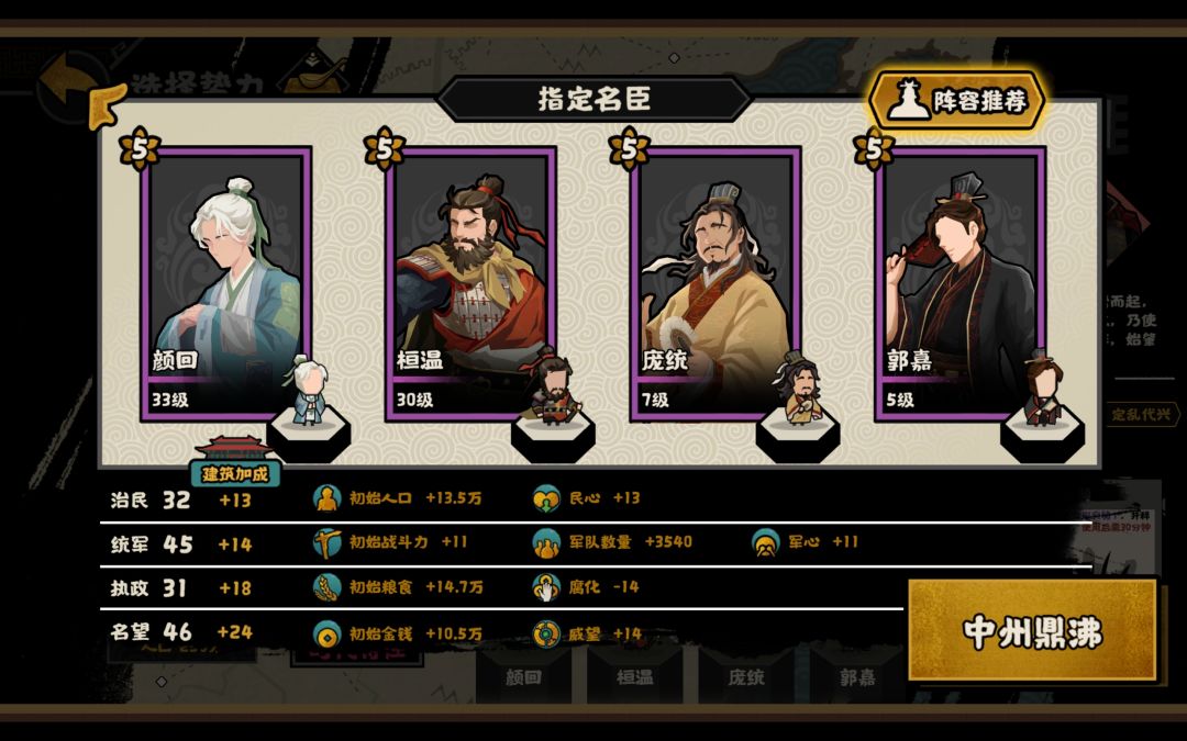 总结:四个名臣作为地级都很好获取,不太吃星级,也比老国家队更强更全面,唯一的缺点是只有桓温提供威望加成