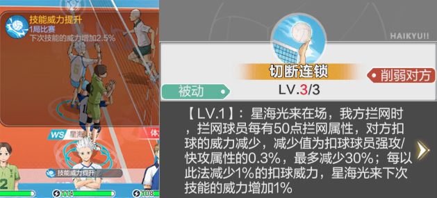 星海光来在场,我方拦网时,拦网球员每有50点拦网属性,对方扣球的威力减少,减少值为扣球球员强攻/快攻属性的0.3%/0.3%/0.3%,最多减少30%/40%/50%;每以此法减少1%的扣球威力,星海光来下次技能的威力增加1%
