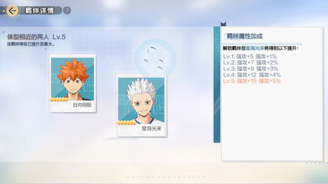 目前只有一个和小太阳的羁绊【体型相近的两人】:星海增加强攻属性。