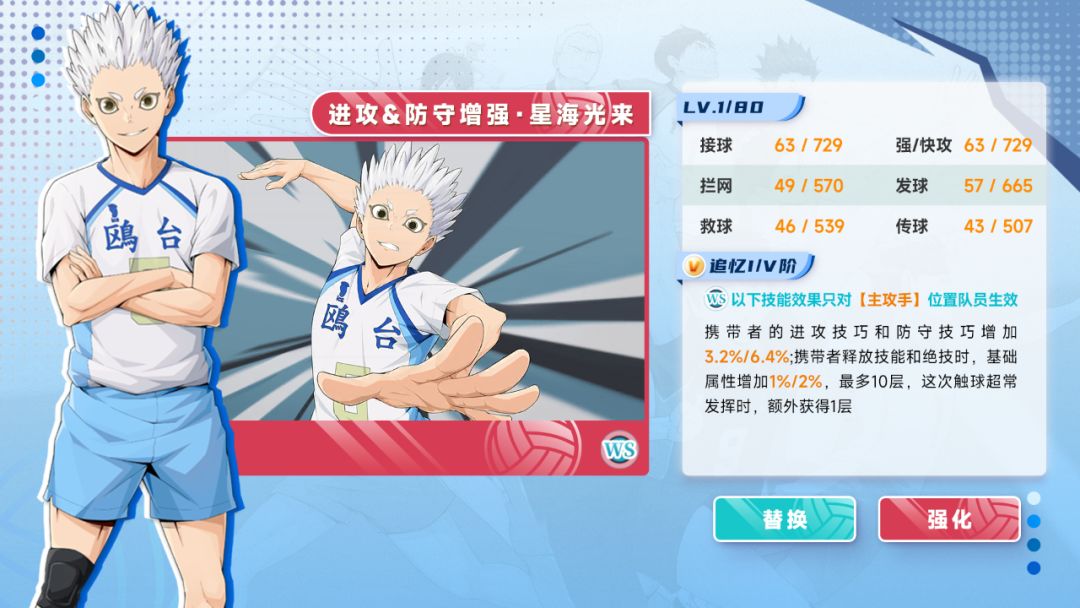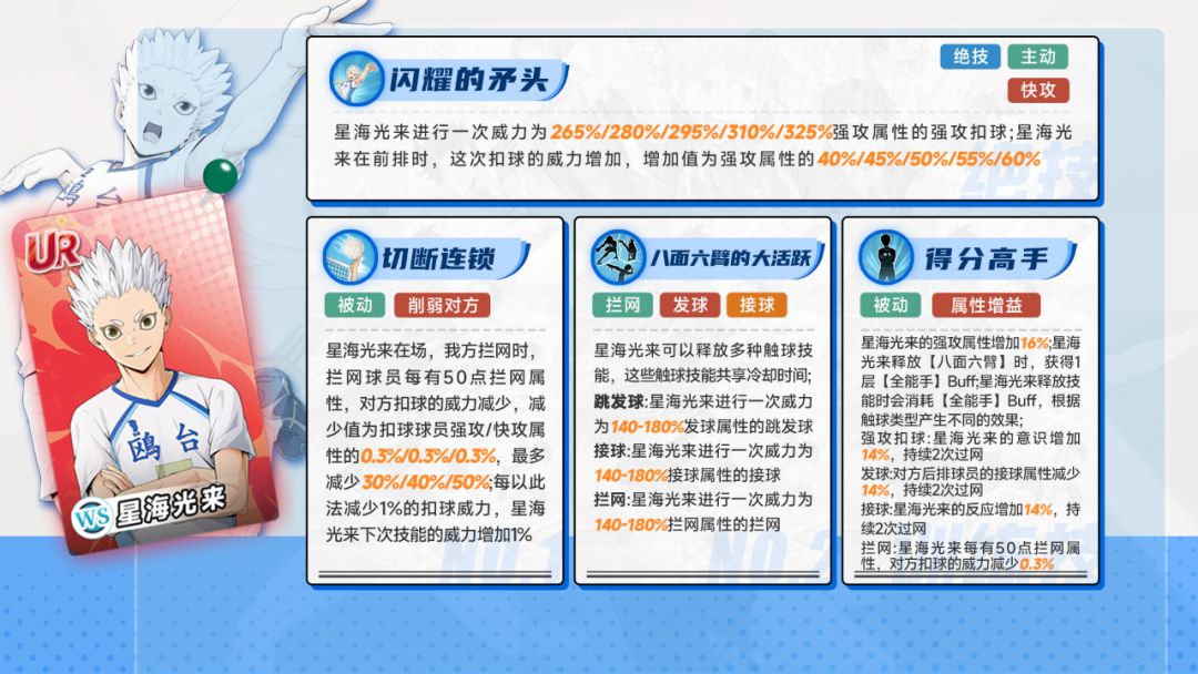 星海光来扣球时星海光来的强攻属性增加,增加值为快攻属性的100%,星海光来在场,我方发球或拦网时,星海光来的力量和精神增加10%,最多5层;