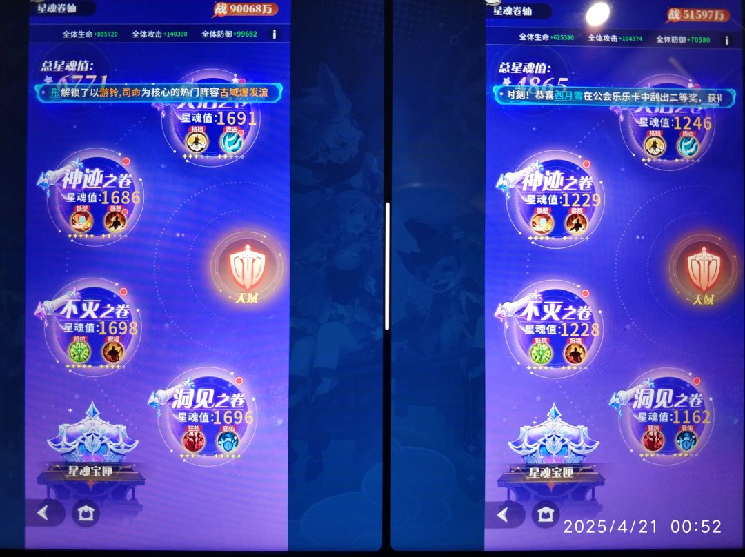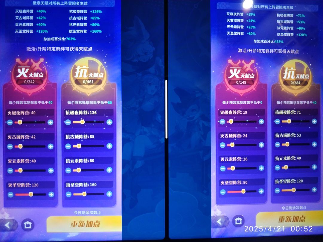 10星魂天赋(抗灭):优先全部激活,然后升阶带橙色卡片的抗性,12阶以后抗灭减半,所以先把抗星魂升到12阶再升灭,全部12阶以后再升抗,蓝绿星魂卡片可以随便升。天赋优先点圣堂抗灭,因为推图最难杀的利欧,PK伤害最高的三姝和蕾娜都是圣堂的。其他抗灭平均升,可以多升一点抗极夜,因为NPC切后排最强的鱼缸头,猎魔者和普攻最难杀的影盾都是极夜。