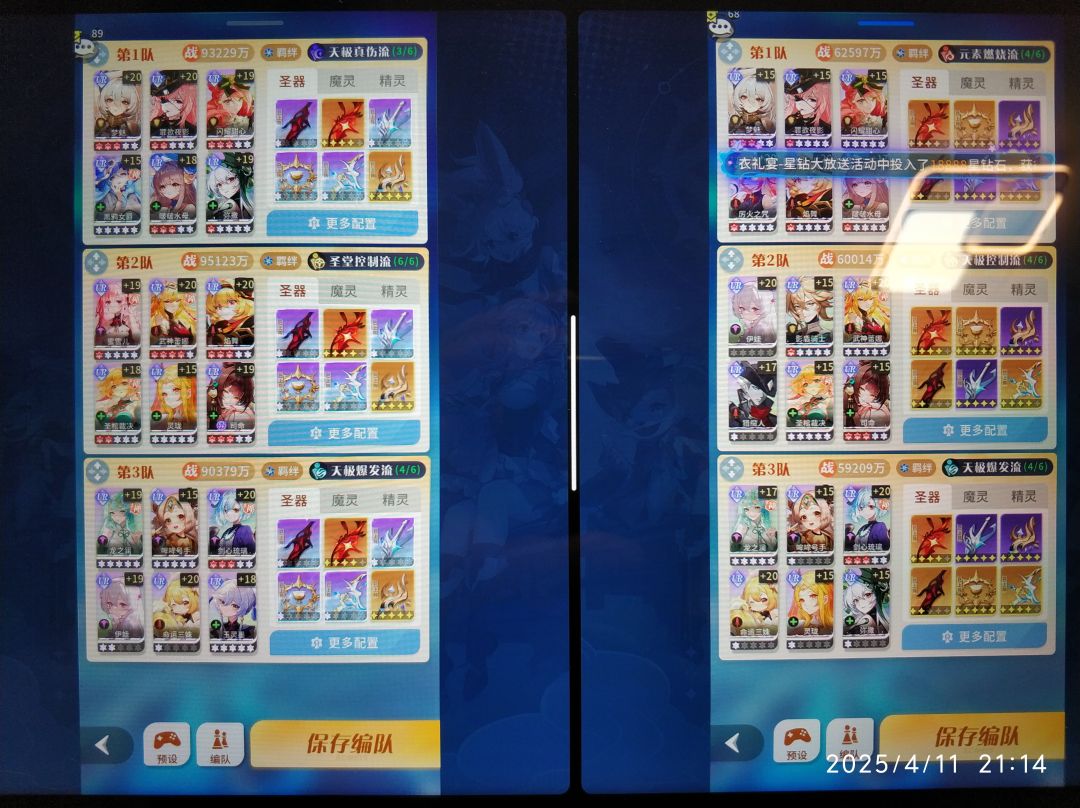这样每个阵容都有治疗和前排,多队综合实力比较强。注意推图只有星魂需要二队强度。天梯,荣耀排位有疲劳,需要4队强度。巅峰对决传奇前三局两胜,角色不够可以优先双强队,传奇后五队输赢不影响奖励。