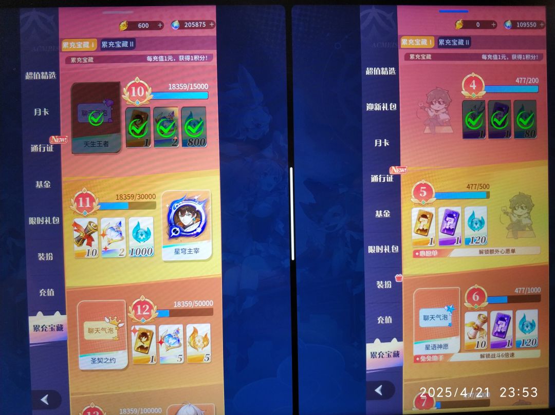 下图是大小号的氪度和余钻,大号是早期买的万氪号,接手就一个特聘和五星弥撒有用,后面自己陆陆续续冲了两千多也算是培养起来了,对比现在直接买的高战号,还是自己养的号玩的舒服。小号是开服冲了大小月卡季卡永久卡变异和几天体力,发现新号太难玩起来了不如买号去玩了。