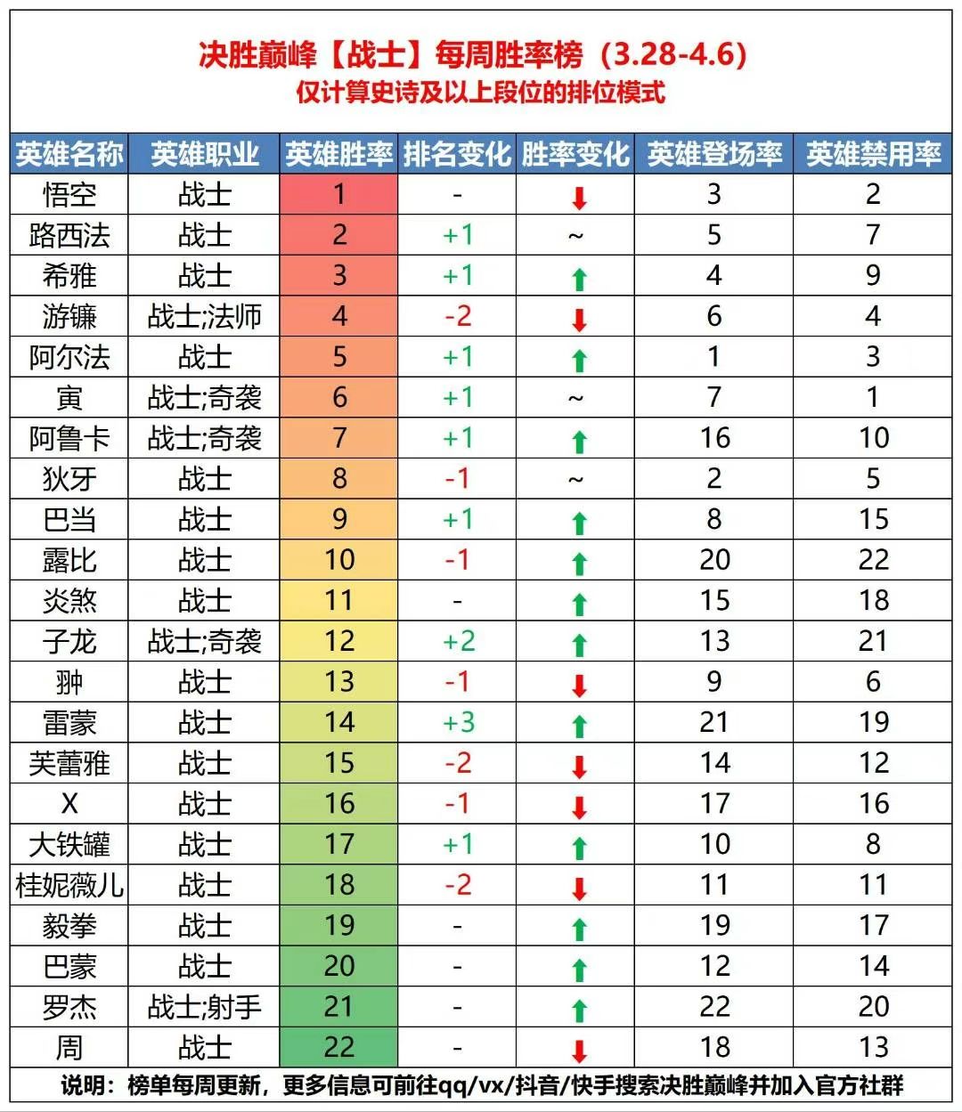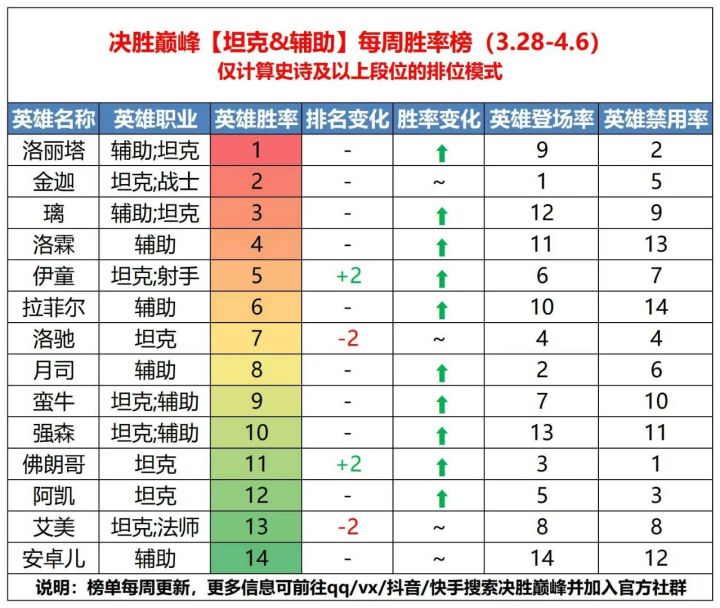 上分必备!3.28-4.6英雄胜率排行榜