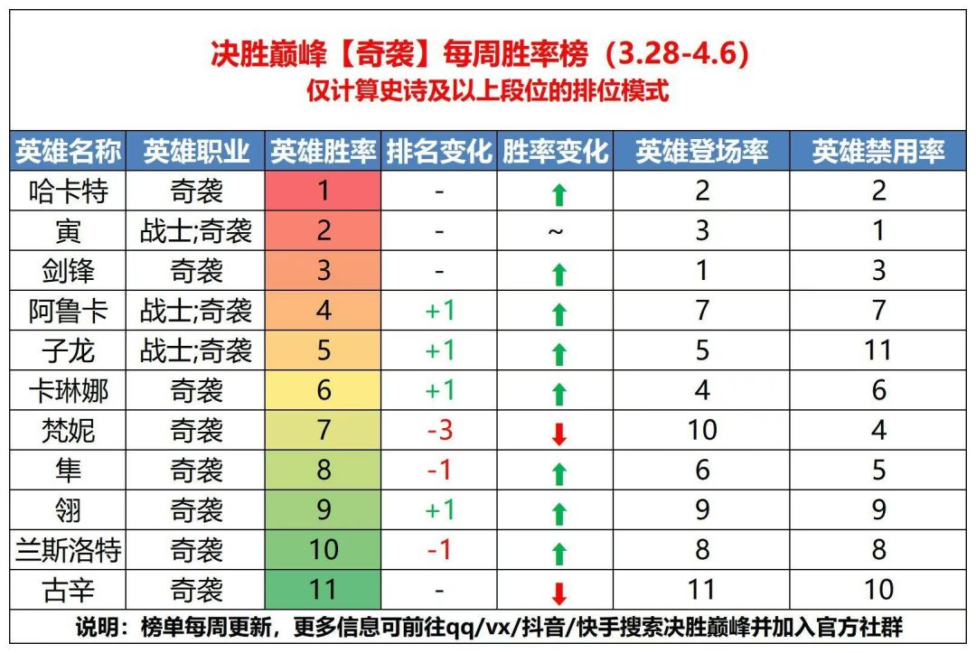 4、【奇袭】:奇袭榜中胜率近乎全面上涨,仅梵妮、古辛胜率下跌。