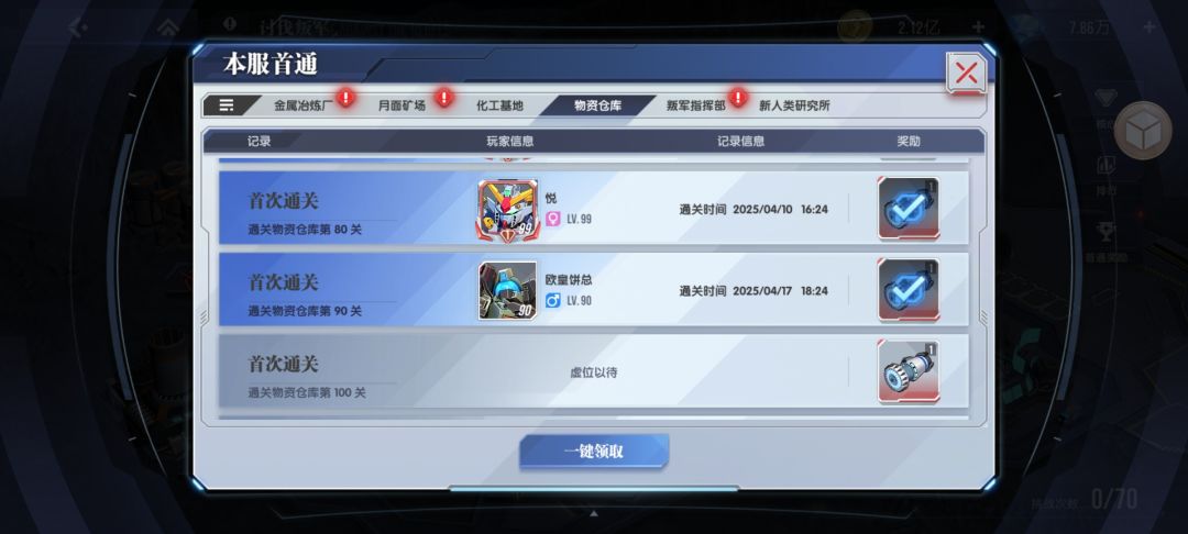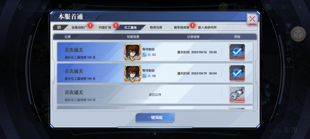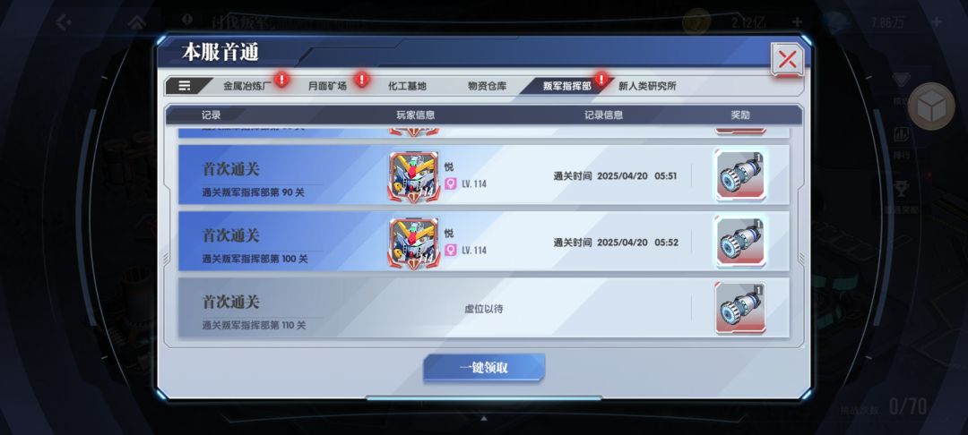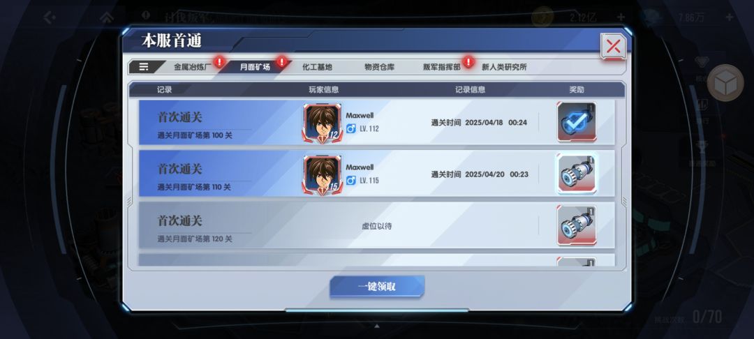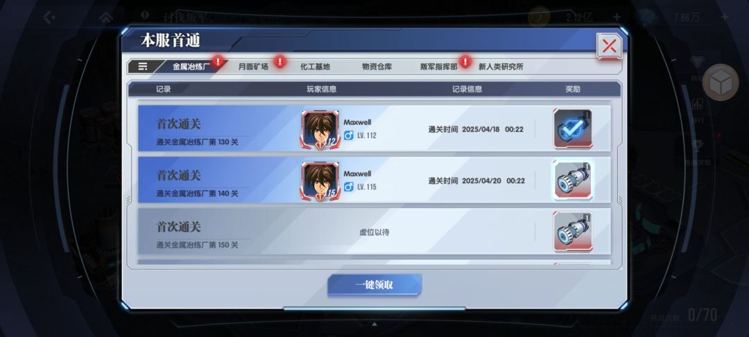 下面是我们区分系打的首通,其实开始并没有沟通这个事情,这就是默契,这样才能尽可能多的获取提升技能需要核心启动装置,尽早的提升各系关键技能。这个首通奖励是全服玩家共享的,所以,如果没有默契,最好提前最好沟通。这样才能做到最快速的拿到更多的核心启动装置,提升核心的技能等级。