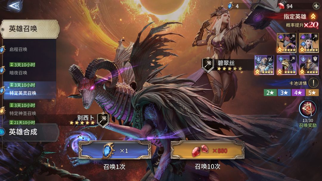 英灵召唤池为200抽保底,在获取五星英雄时有20倍的概率获得别西卜或碧翠丝。