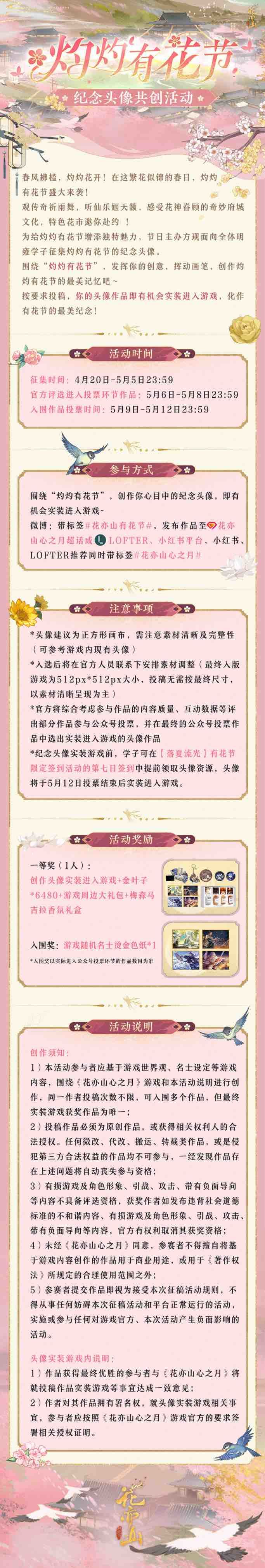围绕“灼灼有花节”,发挥你的创意,挥动画笔,创作你心目中的灼灼有花节头像,即有机会实装进入游戏~