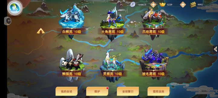 然后有两种路线一是把所有的全部升到6级对应的坐骑会多一个技能便于繁殖,还有一种就是从后往前满级九个开启猎苑设施。