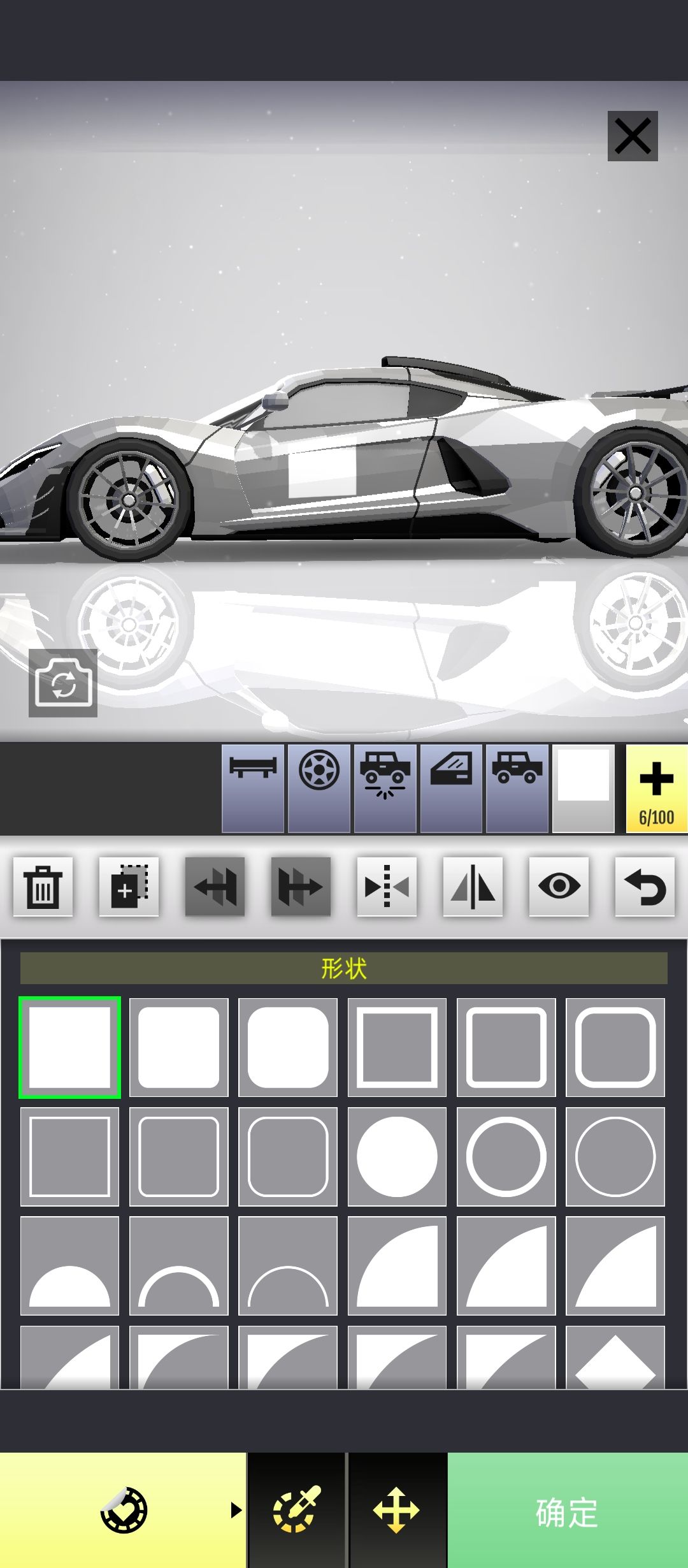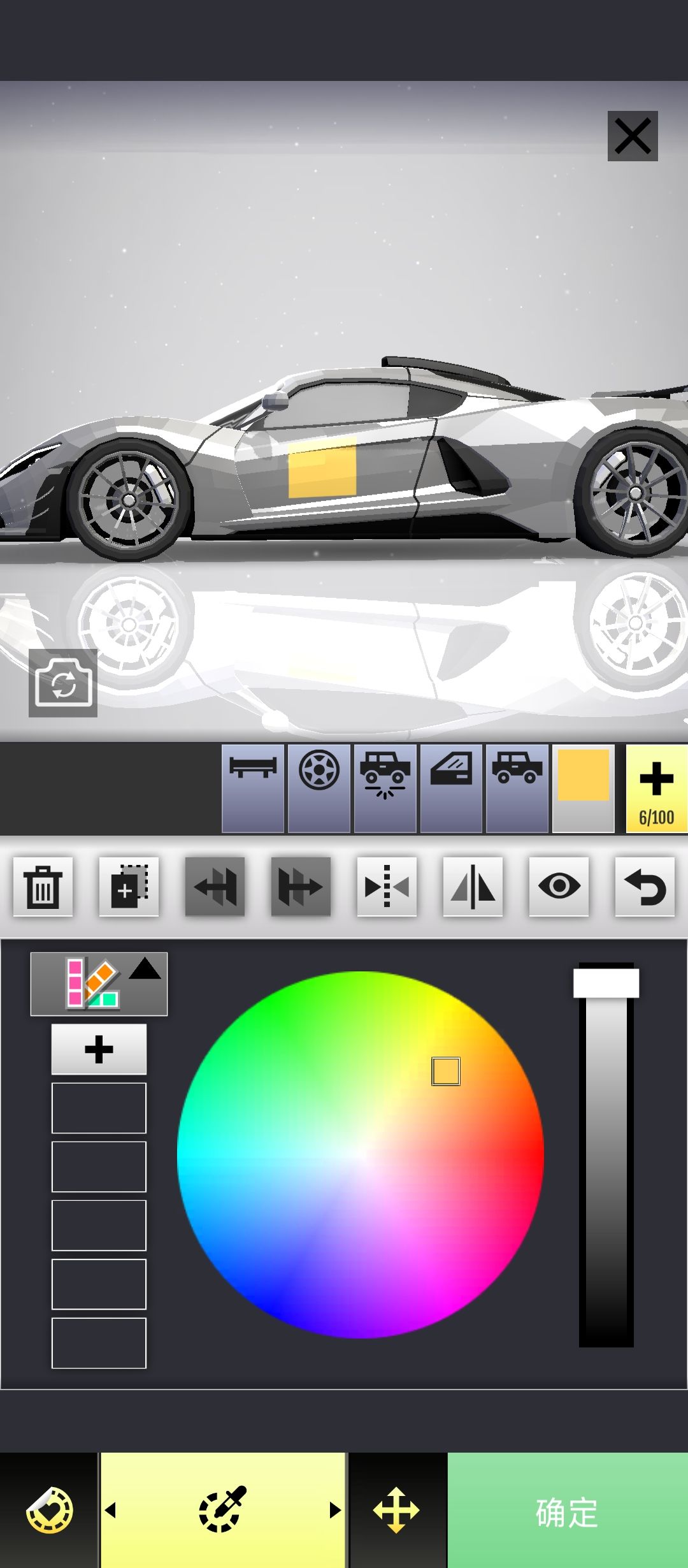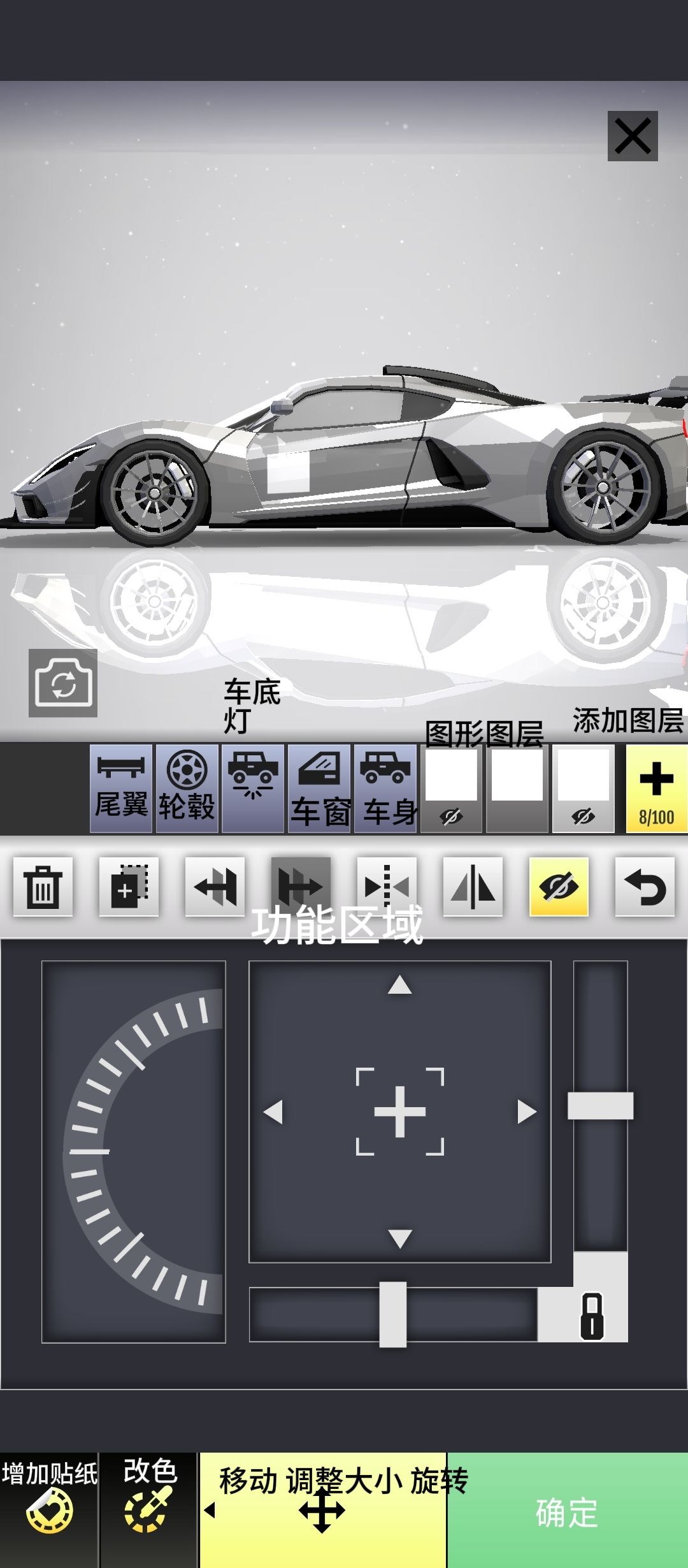 涂装编辑器:首先要说明,涂装编辑器里的图层并不是完整的100个图层,前面的尾翼 轮毂 车底灯 车窗 车身就占了5个图层(也就是实际只有95个图层)前五个选项只能使用改色系统的;