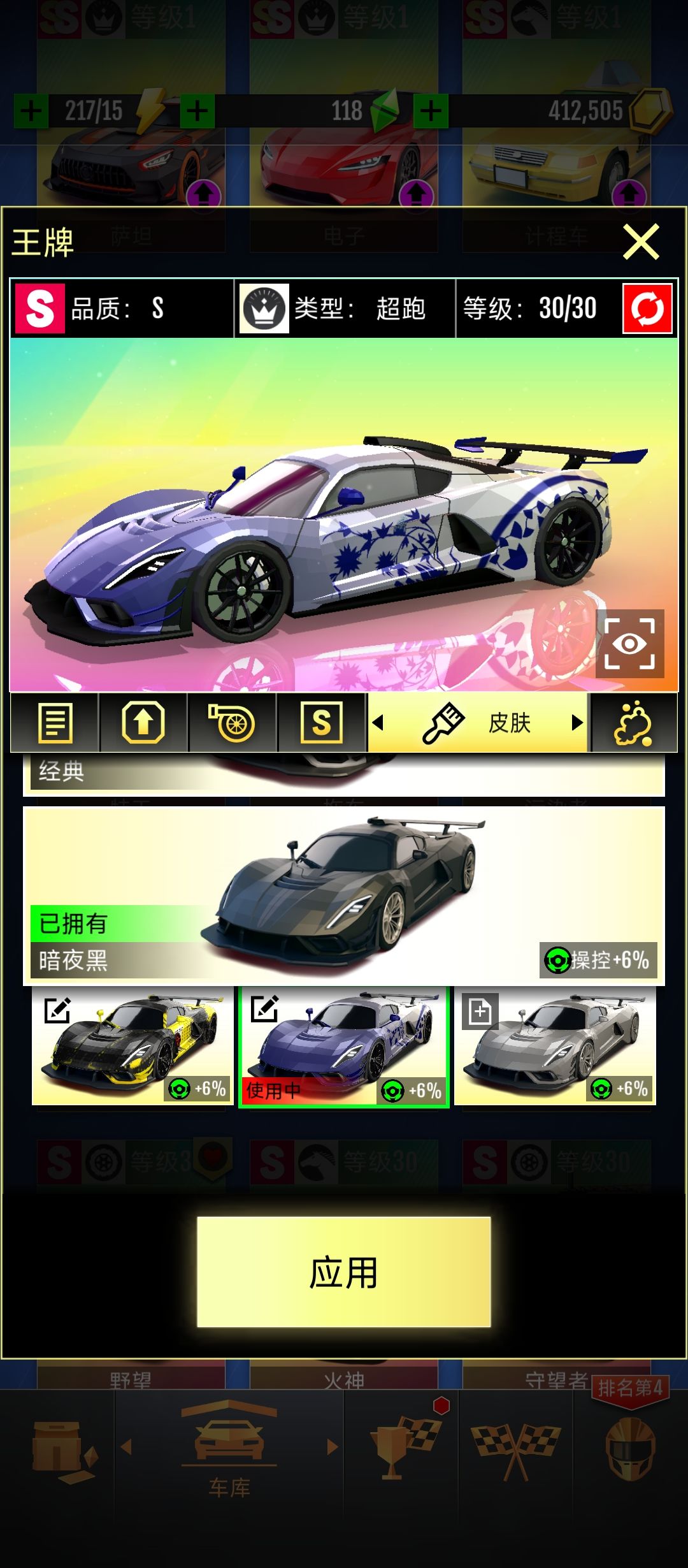 基础教程:在车辆选择界面里(以王牌为示例)皮肤界面里当你购买完皮肤后,下方的三个灰色车辆的选项点进后就可以进入涂装编辑界面了