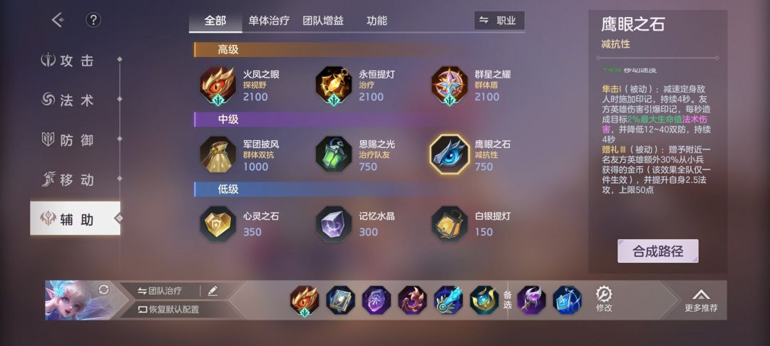 大部妮子走治疗流,现在S2赛季部分装备做了一定调整,使其抬血能不如桑榆。其中鹰眼装备被大部玩家忽略。