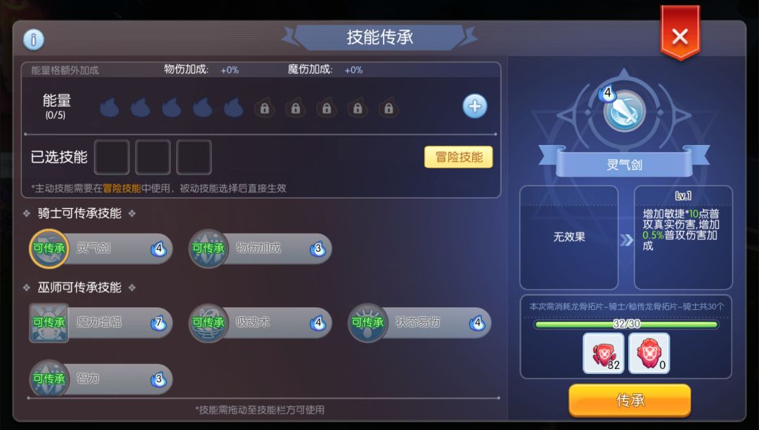 传承技能分为主动技能和被动技能,其中主动技能占据7格能量、被动技能占据3或4格能量。