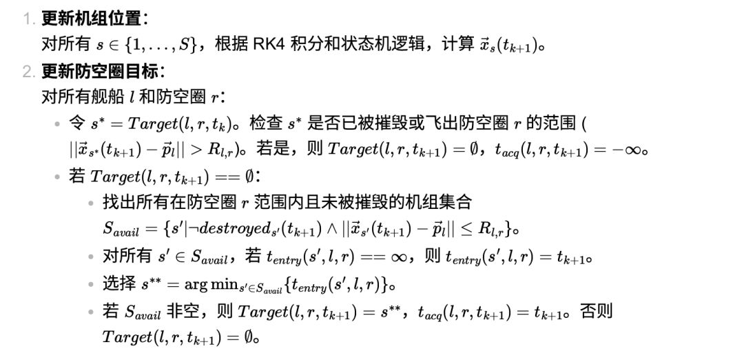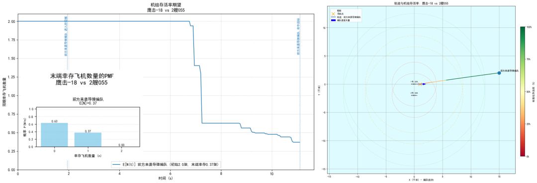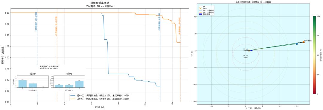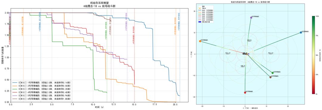 本仿真框架旨在模拟单个攻击机编队对抗一个或多个(类型可不同)位于不同位置的防空舰船的场景。我们不妨将其拆分为两个独立的子问题:机组轨迹与击落概率。只要确定了机组轨迹,并保留时间采样点与轨迹的对应关系,则后者即可在每个时间点上应用贝叶斯公式计算出来。