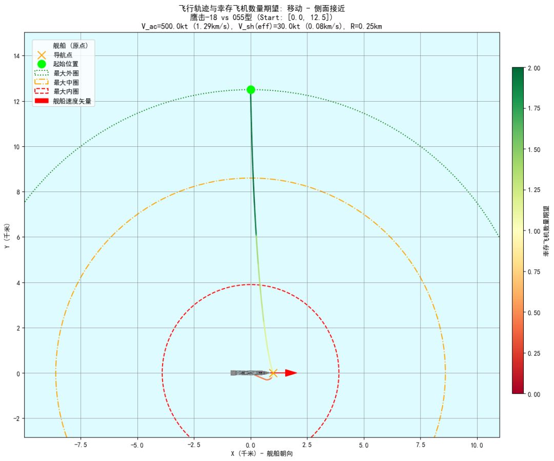 - 即使面对一组导弹,两艘055编队也并非无敌,受击期望为0.37枚导弹,三艘055编队受击期望为0.05枚导弹。侧舷接敌时,两艘055编队受击期望等于0.07枚导弹。