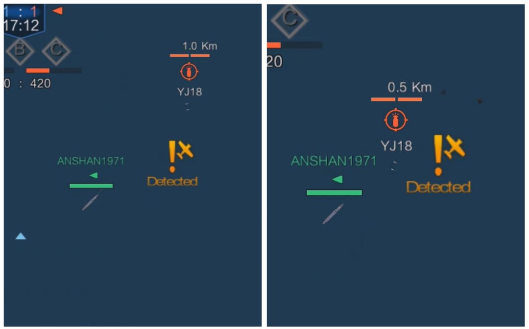 盯帧法可以观察出,游戏内YJ-18回转半径约0.25km,导航点距船首约1.0km