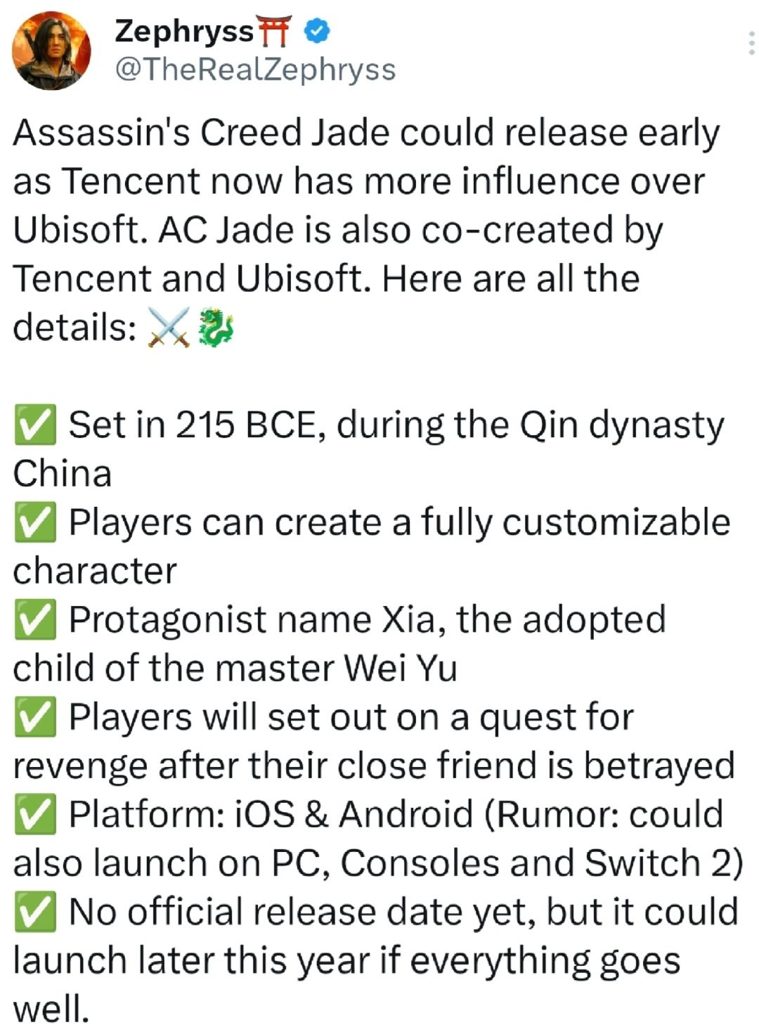 由育碧与腾讯联合开发的手游《刺客信条:侠隐》虽已于2023年12月取得版号,却始终未公布后续进展。知名《刺客信条》社区推主 Zephryss 分析称,近期育碧与腾讯宣布成立合资公司的战略合作,或将推动该作开发进程。
