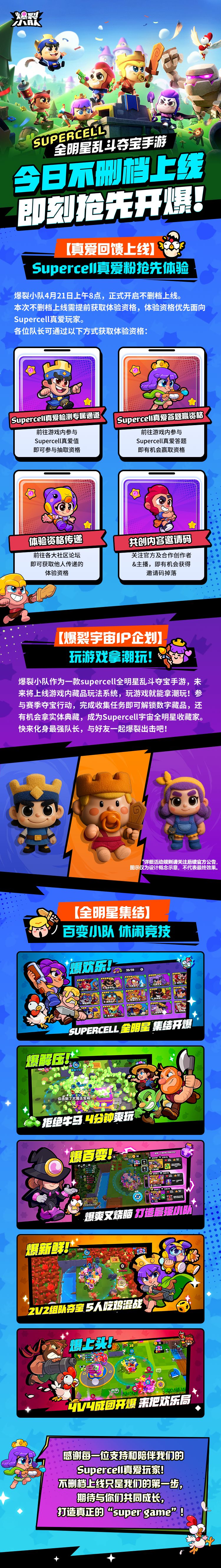 本次不删档上线需提前获取体验资格,并且体验资格将会优先面向一直以来支持Supercell和爆裂小队的“真爱玩家”发放邀请。Supercell真爱粉前往游戏内参与真爱检测或答题活动即有机会赢取真爱粉专属体验资格!更多资格获取方式请查看体验资格获取指南!