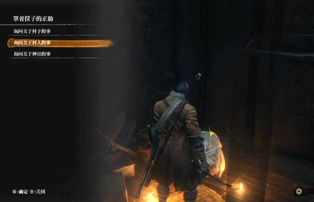 在水生村的屋子里,有一个头戴筐子的NPC,可以像他询问水生村、村民以及神官相关问题,他告诉我们神官的所在之后,并且说让我们去河对面的犬彦的家中有可以长时间燃烧的松脂。
