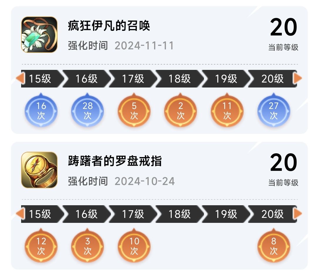 再来看这位勇士,只强化了3件+20装备,就保底了93次,平均强化次数也超过了123次,简直跟凯丽有仇,强化脸太黑,属于强化非酋。不过原始祭坛就不一样了,只刷了239盘原始祭坛,就报了两件无形装备、两件冥界装备、两个强化宝珠,虽然强化有点黑,但是原始祭坛是真欧。