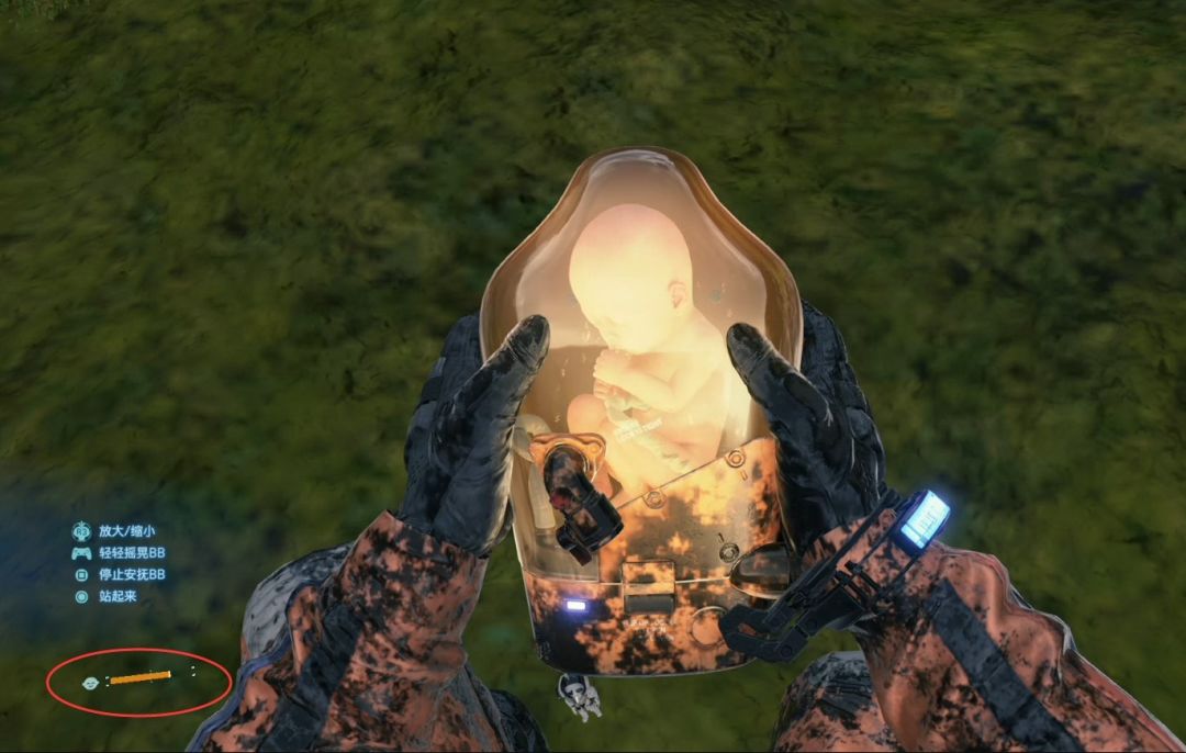 如果BB受到了惊吓不停哭闹,在指南针模式下,按“十字键下”检查BB,再按□安抚BB,然后轻轻摇晃手柄,BB就会慢慢停止哭闹,左下角的“BB快乐条”也会逐渐升满。