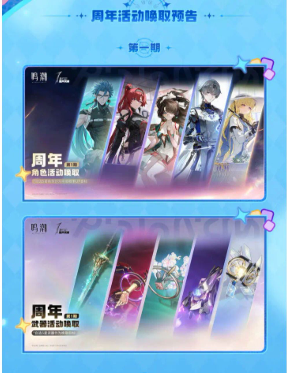 ⭐2.24池连发,周年庆版本自选up这件事也是早就吹风过了的,除了守岸人,椿,和水母都up。这个卡池在新时代二游里并不算前无来者,崩3周年庆和过年也会轮转自选池,但毕竟体量摆在那里。那库洛火急火燎摆出24池来到底是为什么?答案是藏木于林。其实库洛也知道自己的大部分角色并不具有复刻抽取价值,1.x的角色才刚刚复刻过一轮,2.x的角色首次up也才没几个月,那为什么要孤注一掷的开24up池?因为24个池其实只是为了1个池打掩护:菲比池。这就是藏木于林。库洛的24池其实是分上下半开的,下面是复刻表,请问上半复刻看出来什么突兀的吗?