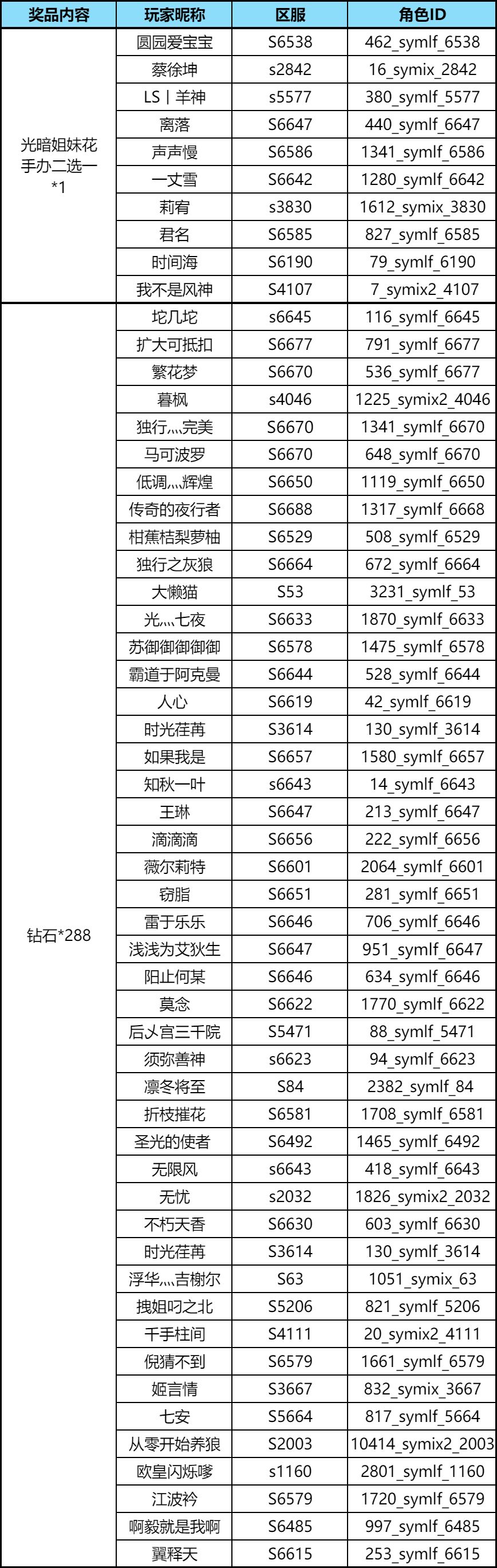 闪妹一位位仔细阅读了大家的评论,最终筛选出有效参与(正确留下了自己角色ID)且中奖(排除重复参与)的冒险者大人56人!由于本次参与活动的冒险者人数达成了30+,除了参与的大人们能够全都获得了【钻石*288】,还有10位大人获得了【光暗姐妹花手办二选一*1】奖励!