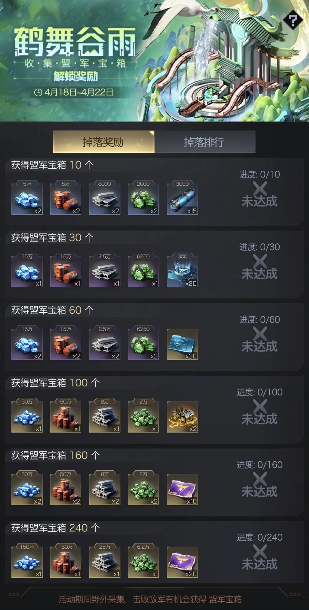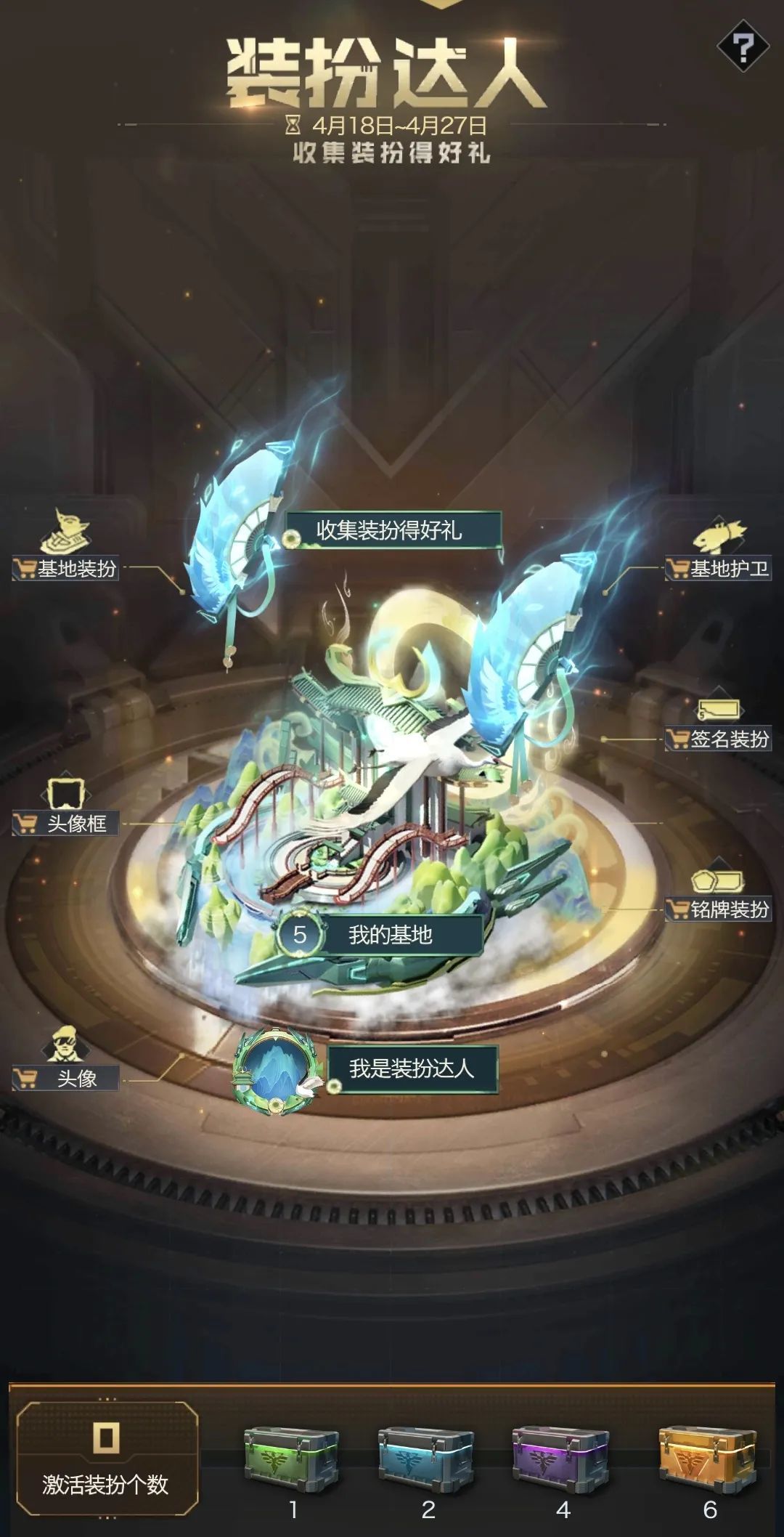活动期间激活鹤舞谷雨装扮数量达到指定目标即可领取对应奖励宝箱,激活6种鹤舞谷雨装扮,即可免费获得万能装扮碎片。