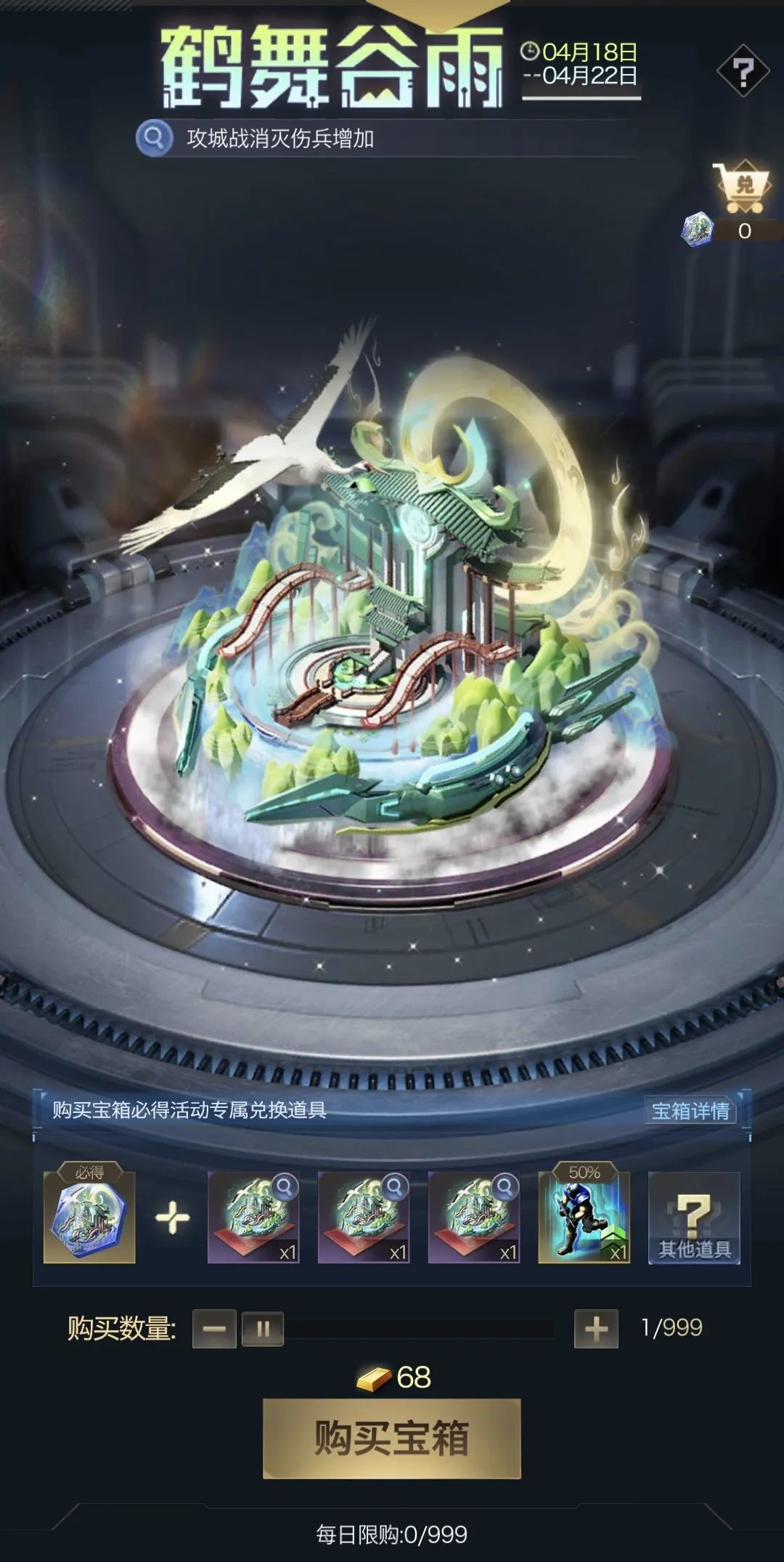 活动期间开启宝箱可获得鹤舞之心,并额外赠送资源、加速和增益道具等资源,更有机会直接获得永久鹤舞谷雨装扮,同时鹤舞之心可用于兑换永久鹤舞谷雨装扮、加速和资源等道具。