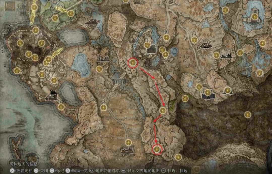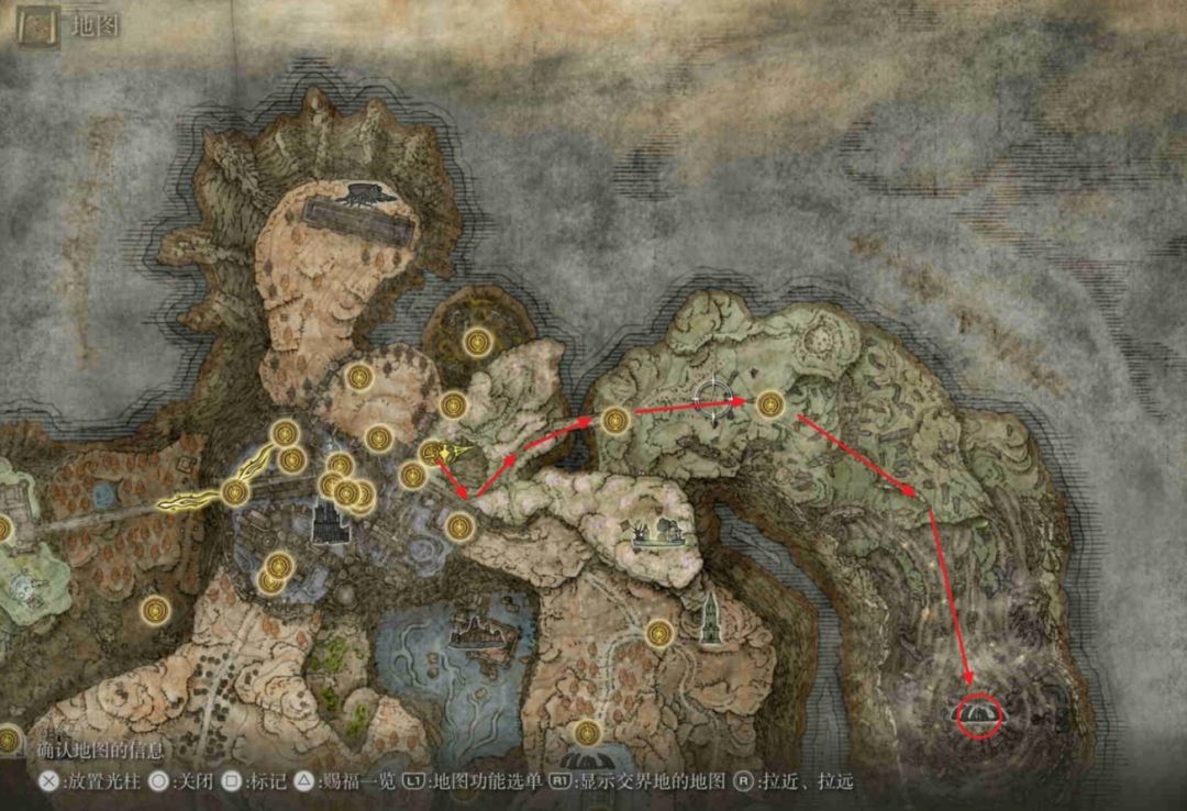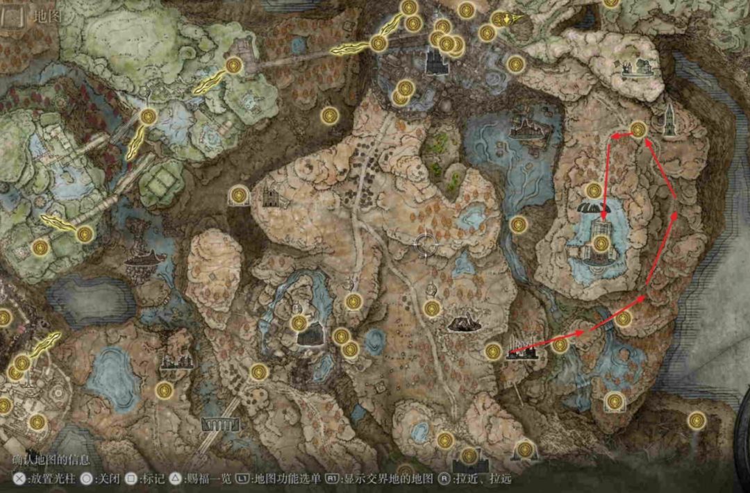 赐福【隐匿之地】出发按照下图路线依次激活【隐匿之地(桥边)】与【指岩山丘】两个赐福,继续往右下的【狄欧指头遗迹】走。