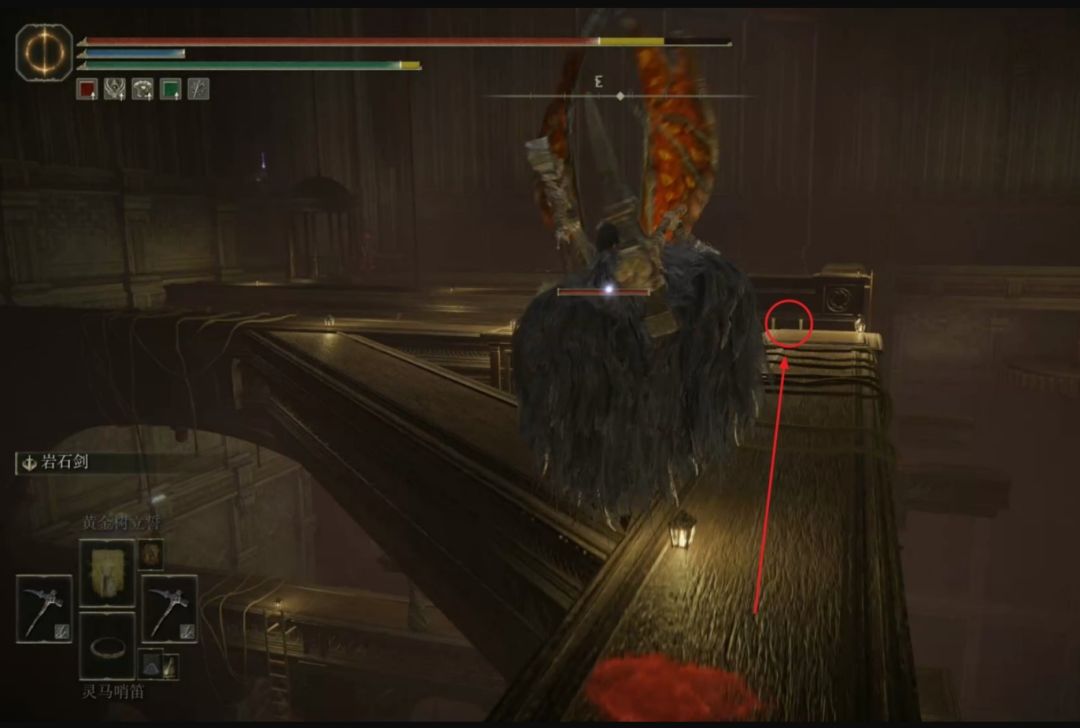 来到横梁上层沿着下图路线继续在横梁上走,注意右侧第二个拐角位置需要跳一下,如果掉下去还得重新按照刚才的路线跑一遍。