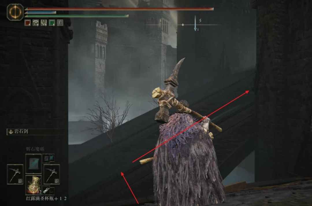 乘坐这个赐福旁边的升降梯上去,升降梯停下后走到前方木横梁的位置往左走,沿着下图路线爬第一个楼梯。