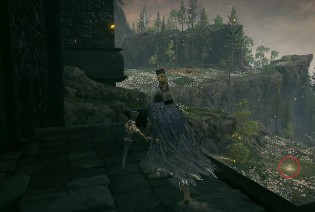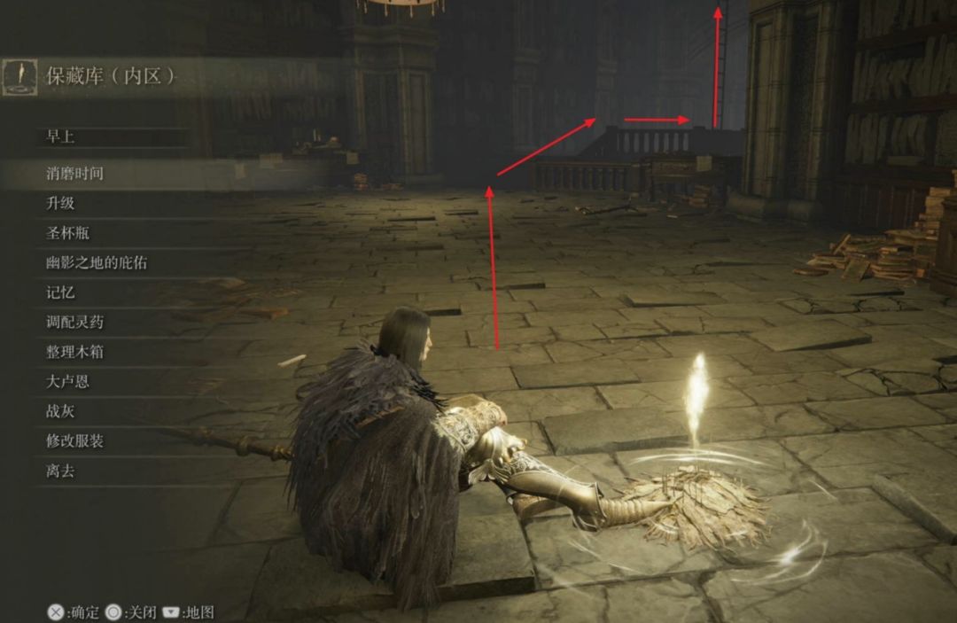 爬到第三层的位置,先走到前方小门的位置,此时往右后方看,通过此处的出口走到外侧楼梯,沿着楼梯爬到上层激活赐福【保藏库(阁楼)】。