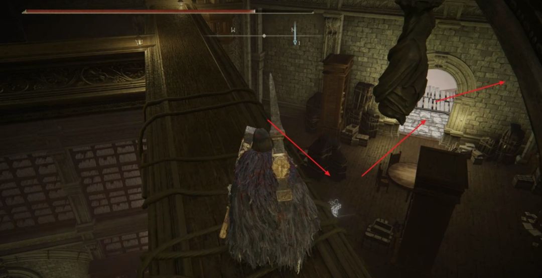 在目标房顶继续跳到前方的梁上继续往上走到房顶。