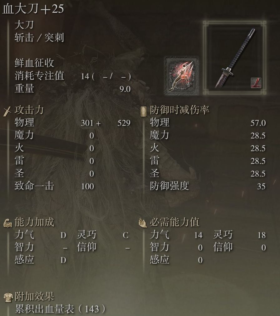 副武器:可随意选择,战技携带切腹,前有强敌时通过切腹进一步增加自身的出血。