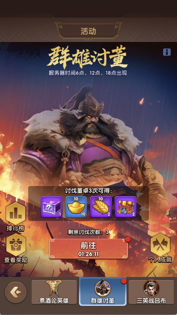 主公每天可在6点、12点、18点参与【群雄讨董】活动,董卓会在每个时间段存在3个小时,每日可参加5次,取当日最高伤害进行排名,来领取每日的排行奖励。对董卓的伤害越高,获得的奖励更丰富。