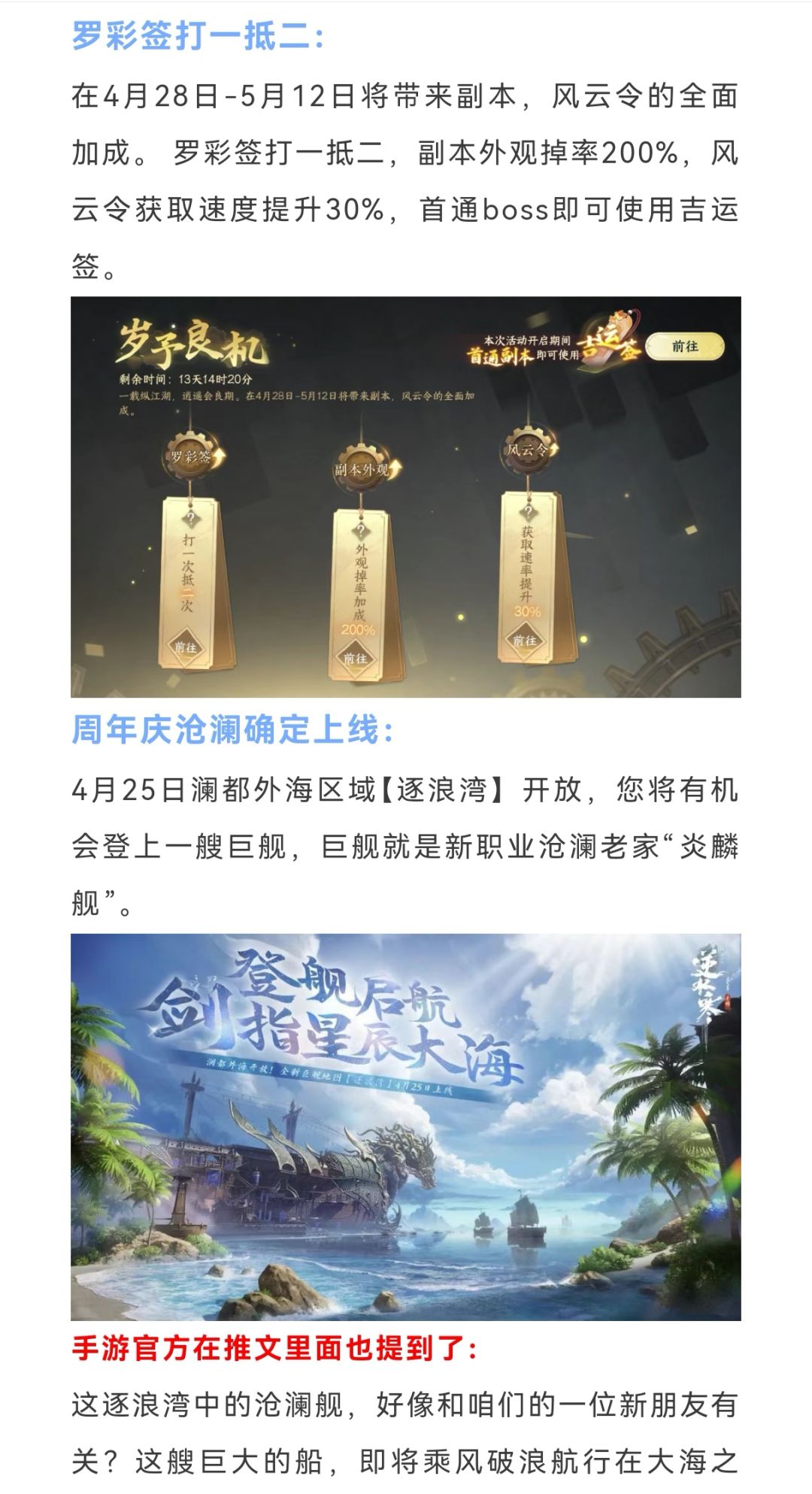 本周五3套新时装合集,周年庆沧澜确定上线,必得半价券+代金券,9个返场外观确定,跨服俱乐部联赛【万仞争锋】,罗彩签打一抵二