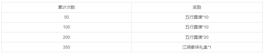 随机奖励:有概率可获得修炼丹、抛光液、极品星、五行露滴、蓝色领悟丹、紫色领悟丹、金色领悟丹、红武千机券、飞火流星、金色精要自选、自选轻功礼箱。