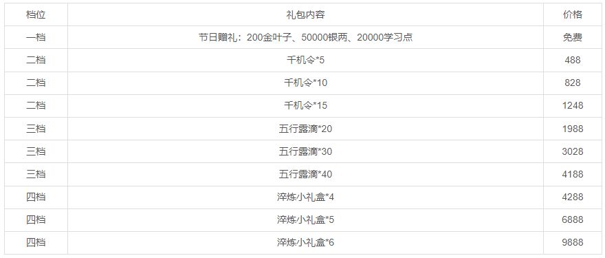活动一:活动期间将限时上架节日礼包,礼包内容如下: