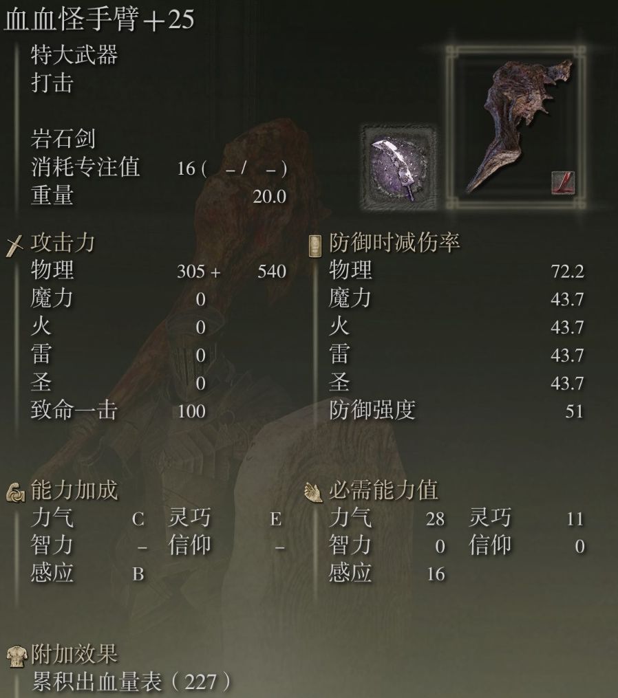 右手带血血怪手臂,是这个流派的核心武器,使用岩石剑战灰与血质变,因为武器的重击自带出血效果,因此有了血质变的血血怪手臂除了高削韧还拥有了高出血的特性。