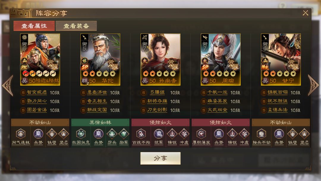 本套由荀彧加入的奠基孙吴,虽然失去了同阵营属性加成,但丝毫不影响SP周瑜的暴力发挥,他在荀彧和孙权属性加成的Buff下,智力属性破千非常容易,再结合【奋起余勇】、【魅惑】等战法的增伤加持,很轻松“一刀一个小朋友”非常轻松,最后,本套阵容还有“双头”【勠力同心】的伤害分摊以及SP华佗的辅助,提升SP周瑜的存活能力。