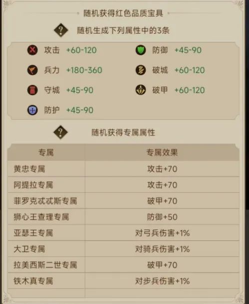 首先防御将,例如赵云,配置防御宝具,2防御1破甲,2防御1防护。攻击及换伤害的将,例如吉尔,配置攻击宝具,2攻击1破甲,2破甲1攻击。
