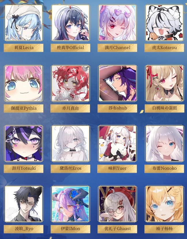 莉夏Lecia 柊真华Official 满月Channel 虎太Kotarou 佩提亚Pythia 赤月真由 莎布shub 白桃味の蛋挞 辞月Yotsuki 黛洛丝Eros 咏枂Yuer 布蕾Nonoko 凌琅_Ryo 伊蒙IMon 优礼子Ghaast 袖子杨杨